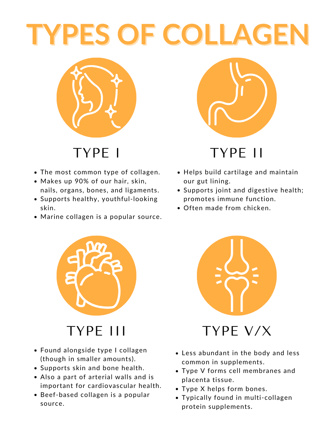 Provides type I collagen (supports the health of skin, hair, nails, ligaments, tendons, bones, and teeth), type V collagen (supports the health of hair, placenta, and the surfaces of cells (including those of the eye), and type X collagen (found in certain layers of cartilage and supports bone and joint health).†